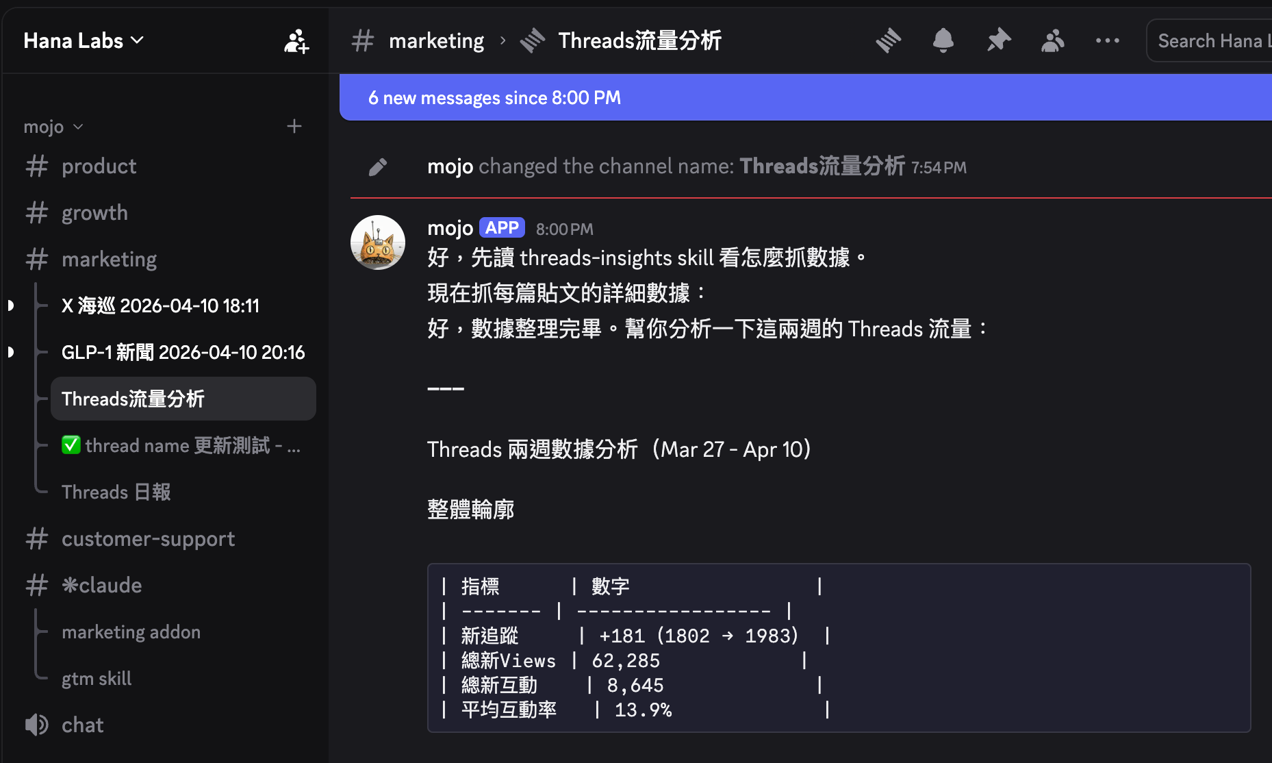設定好後,只要在頻道傳個訊息,agent 會自動開一個 Thread、重新命名。